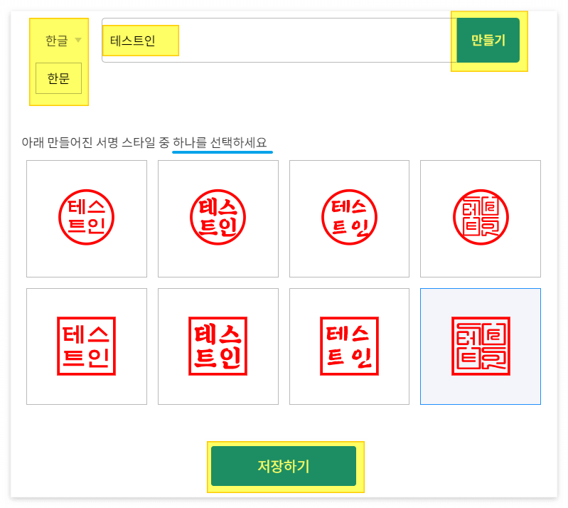 글로싸인 사이트 → 전자도장 만들기 → 일반도장 → 한문/한글 선택 → 한문or한글 기입 → 만들기 → 원하는 스타일 선택 → 저장하기 → 이메일로 보내기 → 메일로 받은 이미지 다운받기