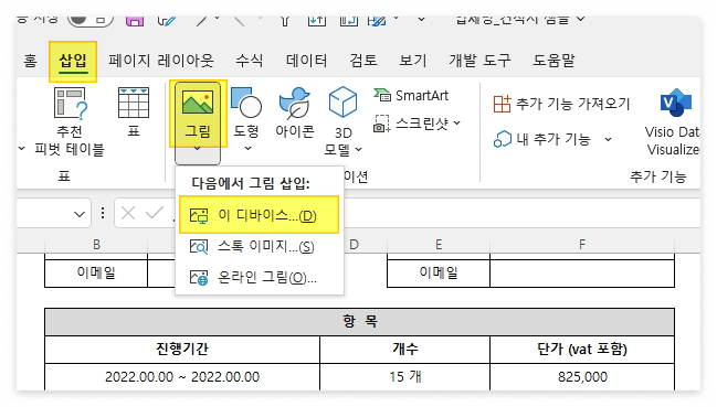 -엑셀/워드 → 삽입 → 그림 → 이 디바이스 → 다운 받은 도장 or 서명 선택